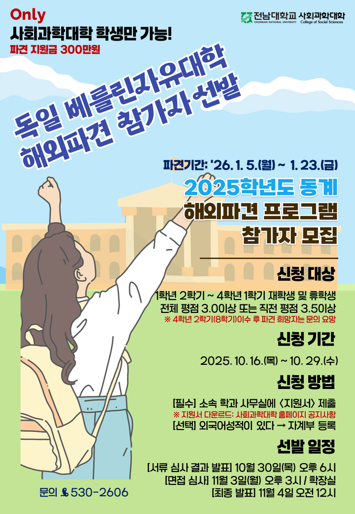 fnctId=bbs,fnctNo=1044 글번호 937188 [새글] 2025학년도 동계 독일베를린자유대학 해외파견 참가자 모집 작성일 2025.10.20 수정일 2025.10.20 작성자 양준성 조회수 41 첨부파일 붙임1_2025 동계 기초보호학문(베를린자유대학) 해외 파견 대상 선발 계획(안).pdf 미리보기 붙임2_해외파견 프로그램 지원서(서식).hwp 미리보기 붙임3_ 졸업사정미포함확인서(단기).hwp 미리보기