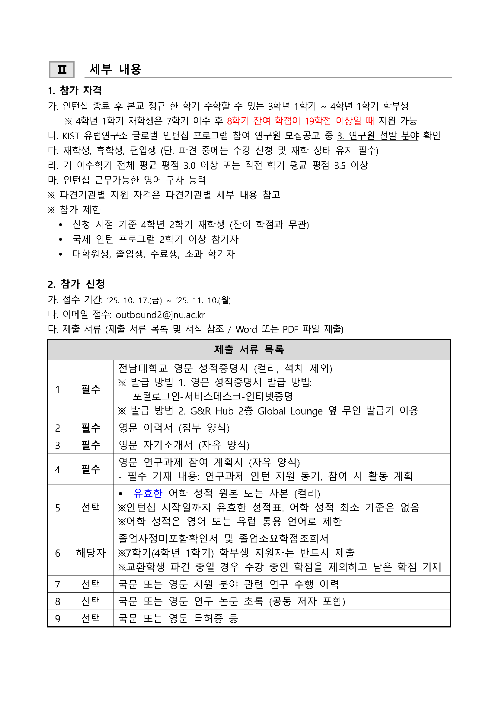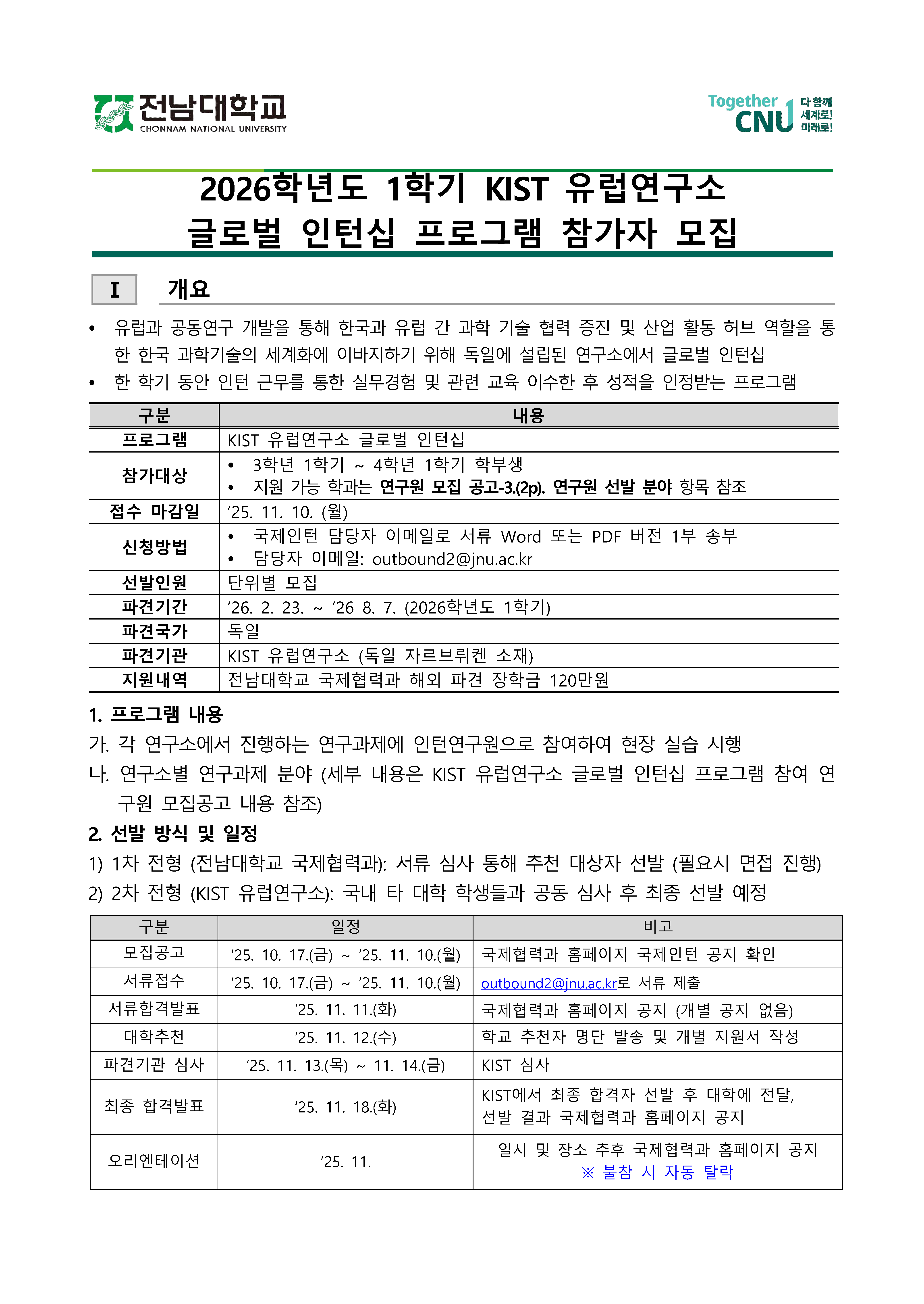 fnctId=bbs,fnctNo=1044 글번호 937190 [새글] 2026학년도 1학기 KIST 유럽연구소 국제인턴 참가자 모집 작성일 2025.10.20 수정일 2025.10.20 작성자 양준성 조회수 34 첨부파일 2026년 1학기 KIST 유럽연구소 글로벌 인턴쉽 프로그램.pdf 미리보기 [KIST 유럽연구소] 영문이력서 양식.docx 미리보기